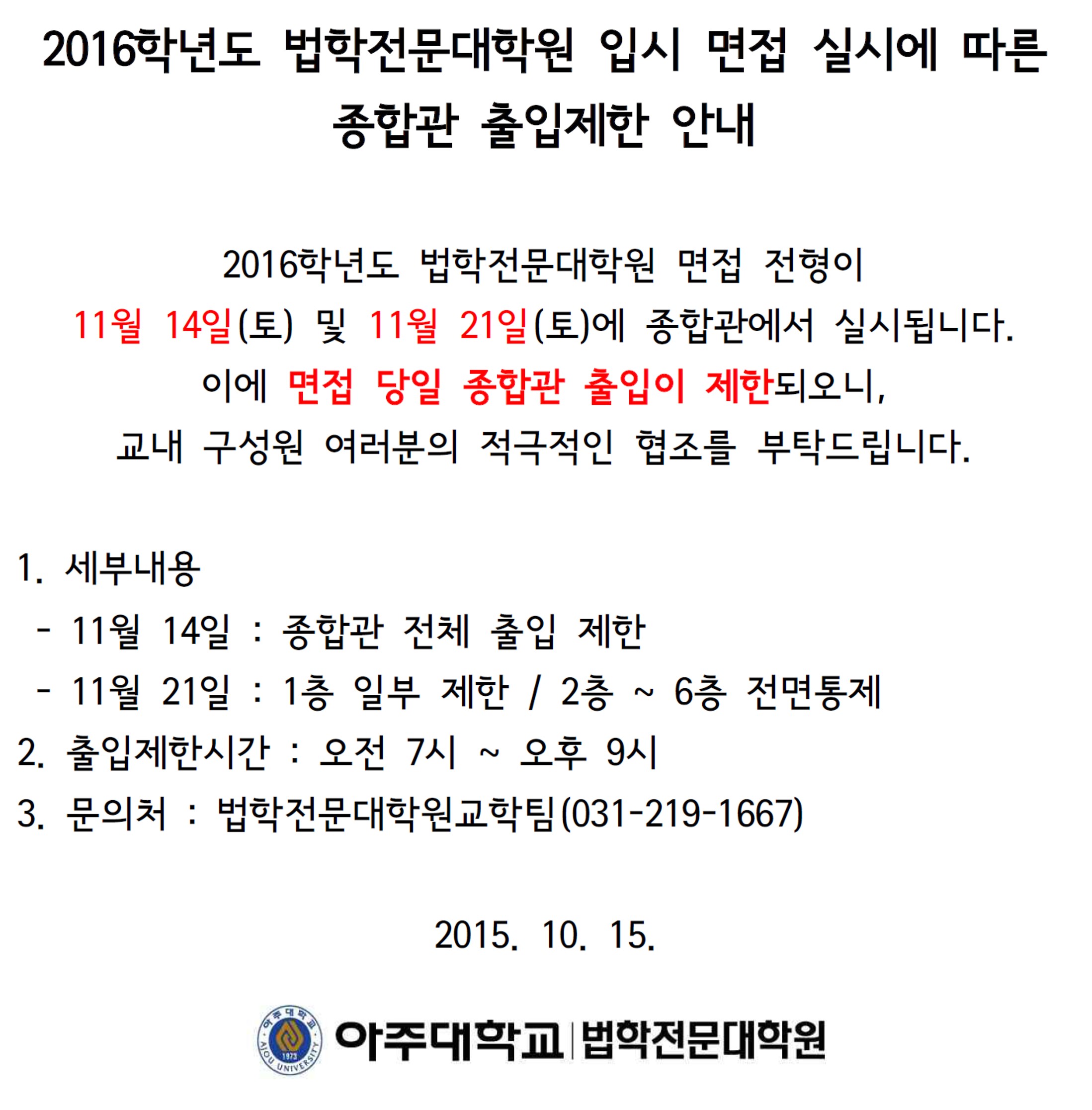 [법학전문대학원] 입시 면접 전형에 따른 종합관 출입 제한 안내