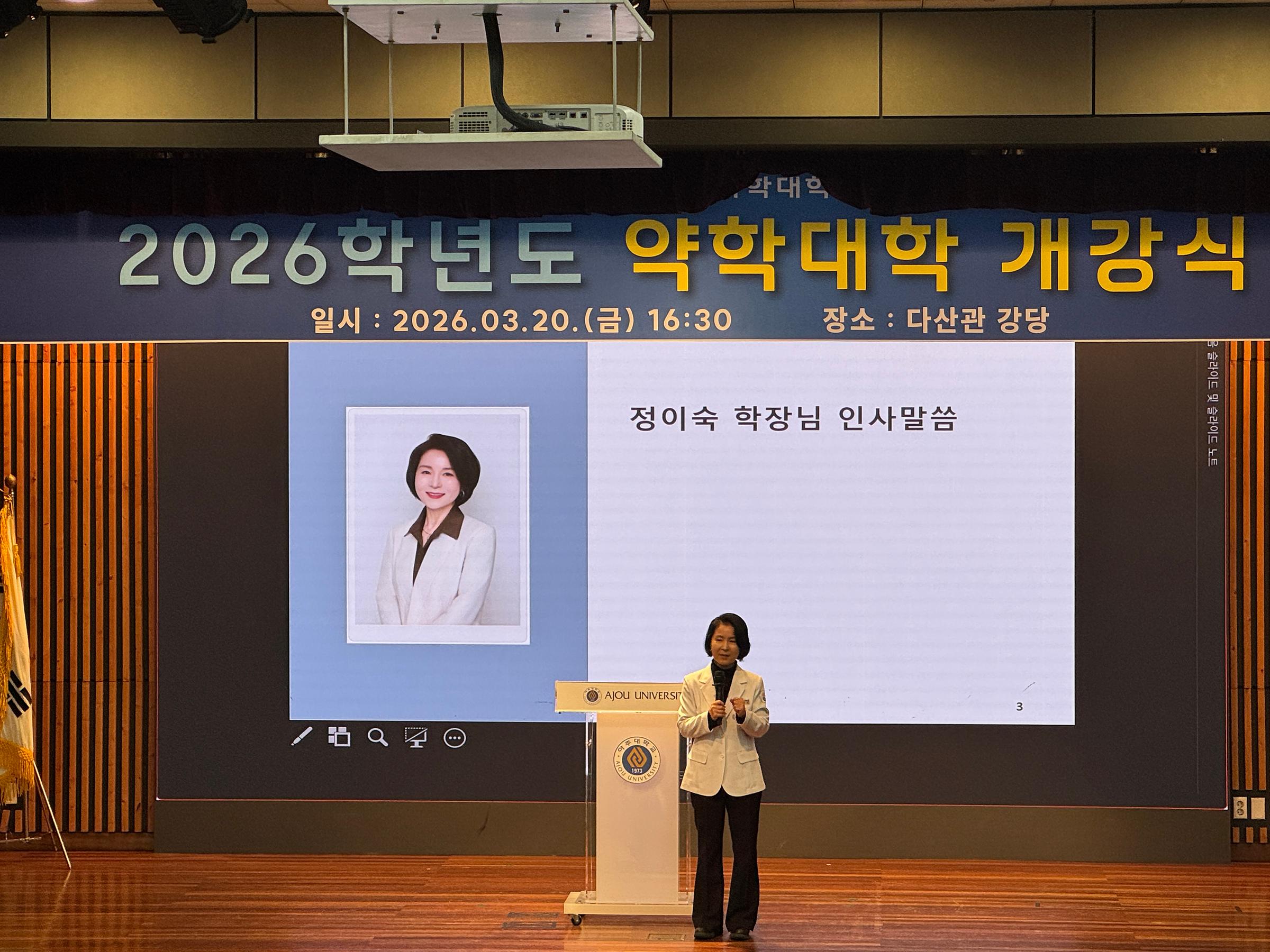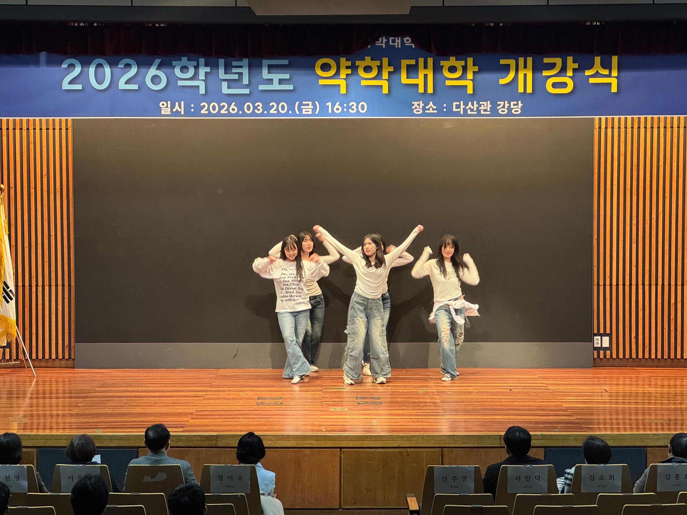 이날 행사는 팝크루의 축하 공연으로 활기차게 막을 열었으며, 이어진 정이숙 학장님의 인사 말씀에서는 “신입생들의 약학대학 입학을 축하하는 동시에, 재학생들이 선후배 사이는 물론 교수님과 교학팀과도 더욱 활발히 교류하고 소통하길 바란다”는 따뜻한 당부가 전해졌다.