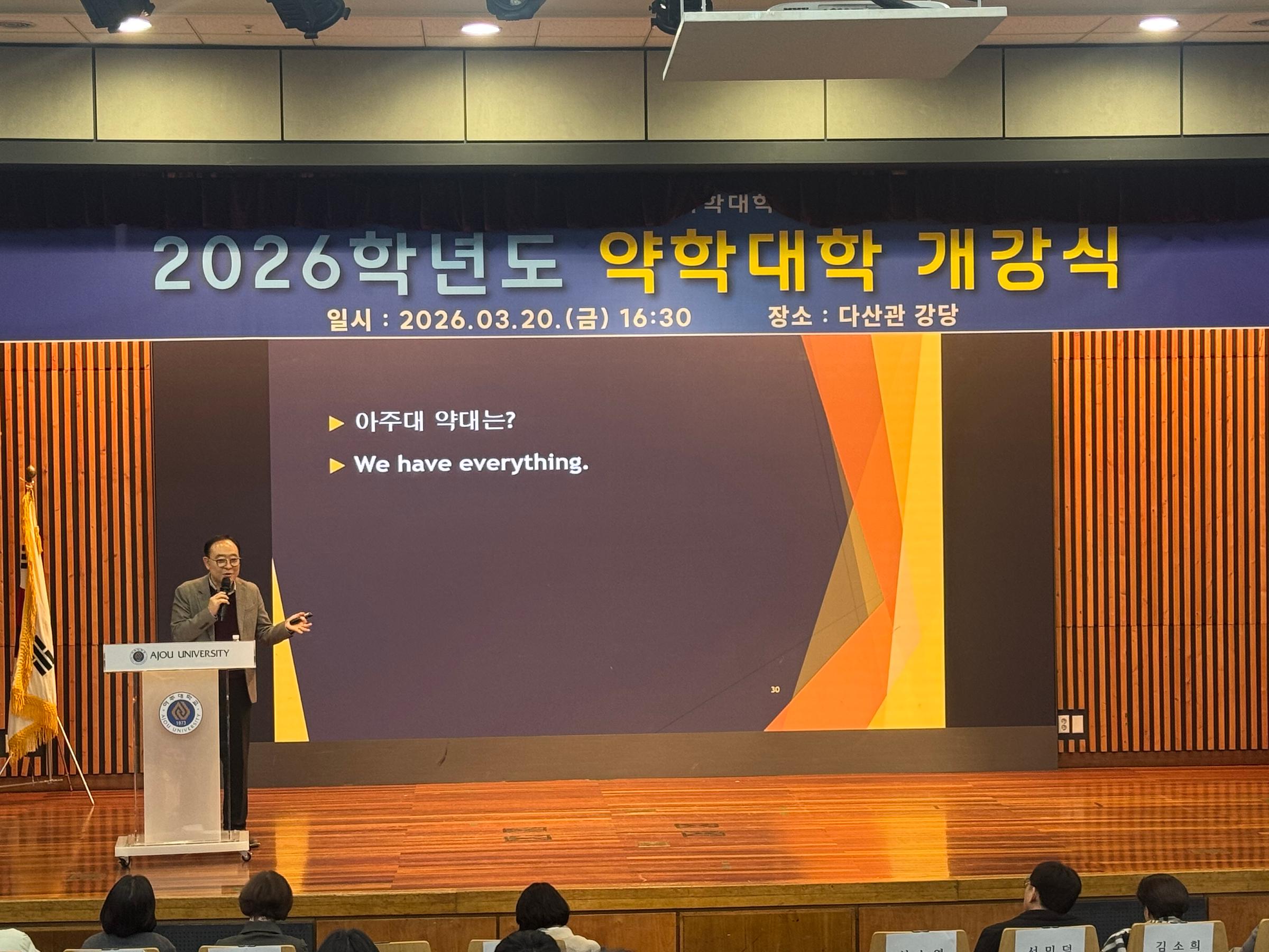 박만규 명예교수님의 “아주대의 역사와 약대의 미래” 주제로 아주대학교의 설립 역사와 약학대학의 비전과 미래를 제시하는 특강이 진행되었으며, 이번 학기 신규 임용된 강동원 교수님과 약학대학 교수님, 학생회, 학년 대표, 동아리, 소학회 소개와 학교생활에 필요한 교육과정, 실