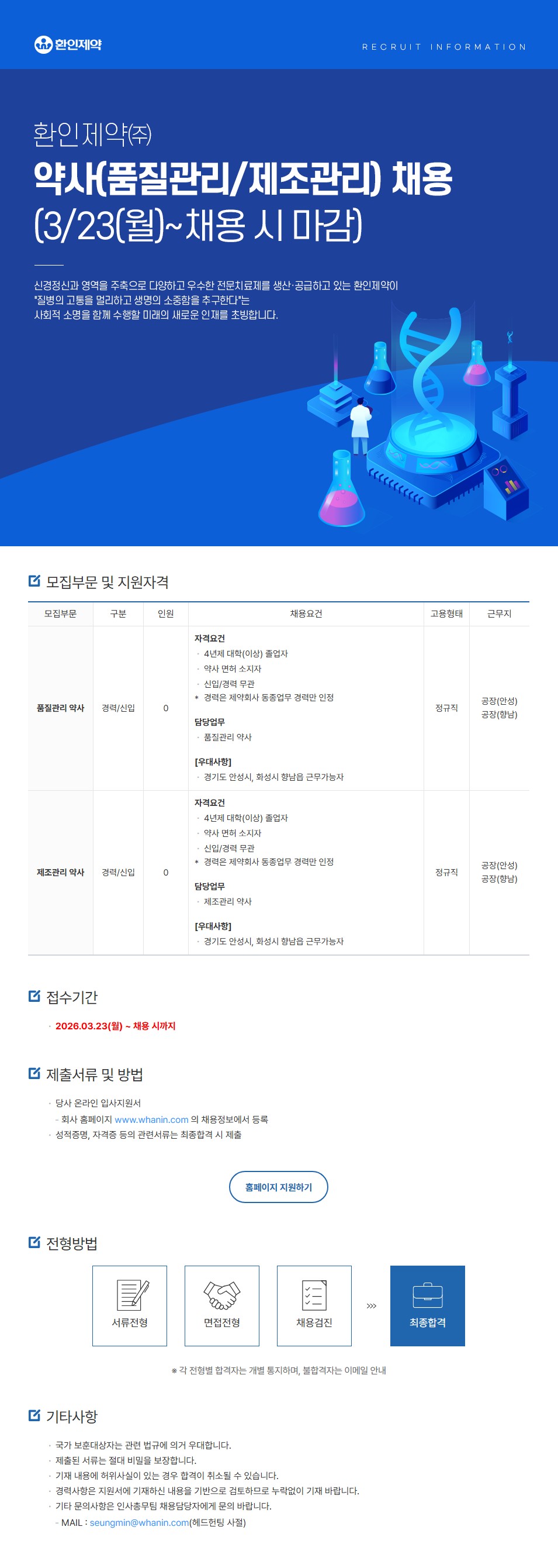 ■ 채용공고(명): 환인제약(주) 약사(품질관리/제조관리) 채용(3/23(월)~채용 시 마감)